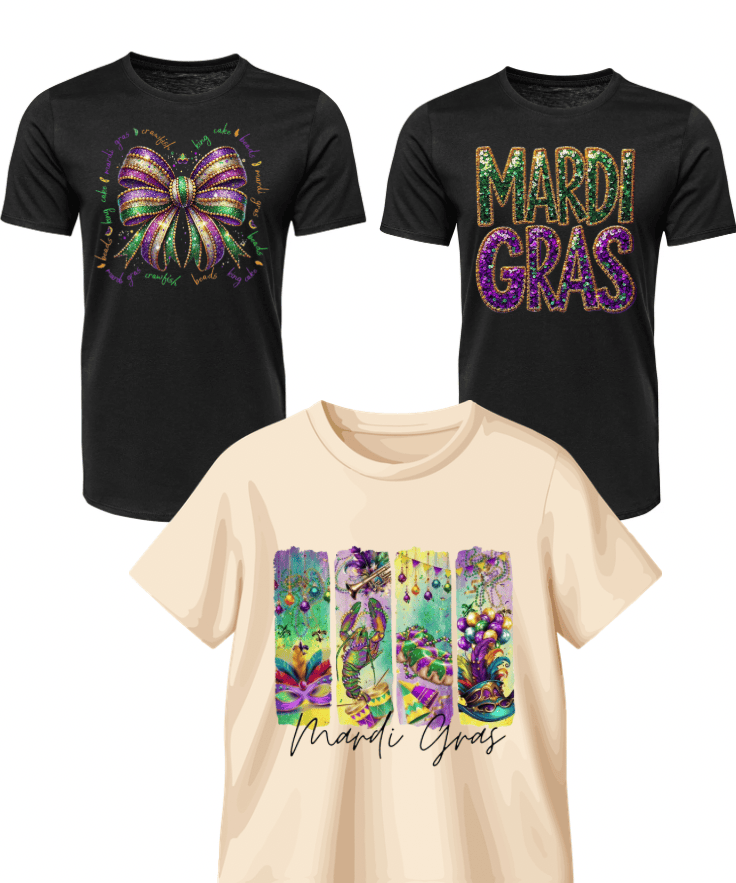 Our Holiday Mystery Grab Bags are finally here! These bags will all include a graphic tee which could be a Gildan, Bella, or comfort color brand, a freshie, and other freebie items that are in line with the theme you choose. Such as Valentines you may receive a cup, Black history you may receive a pin for your shirt or wherever you choose to use it, Mardi Gras you may receive earrings or another fun Mardi Gras items. Each bag/box with be include something unique and creative! We are only offering 25 so get yours while supplies last!Â